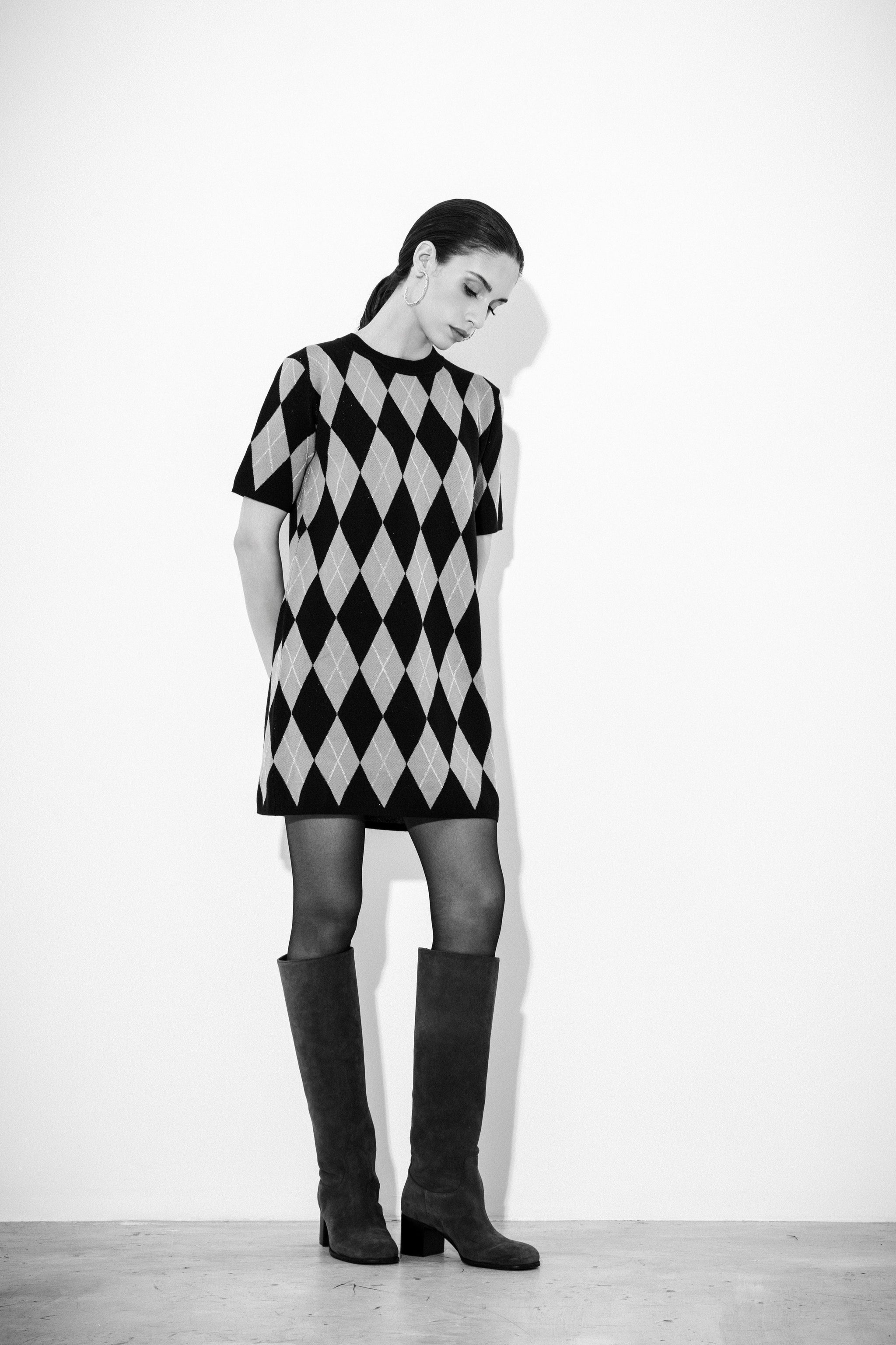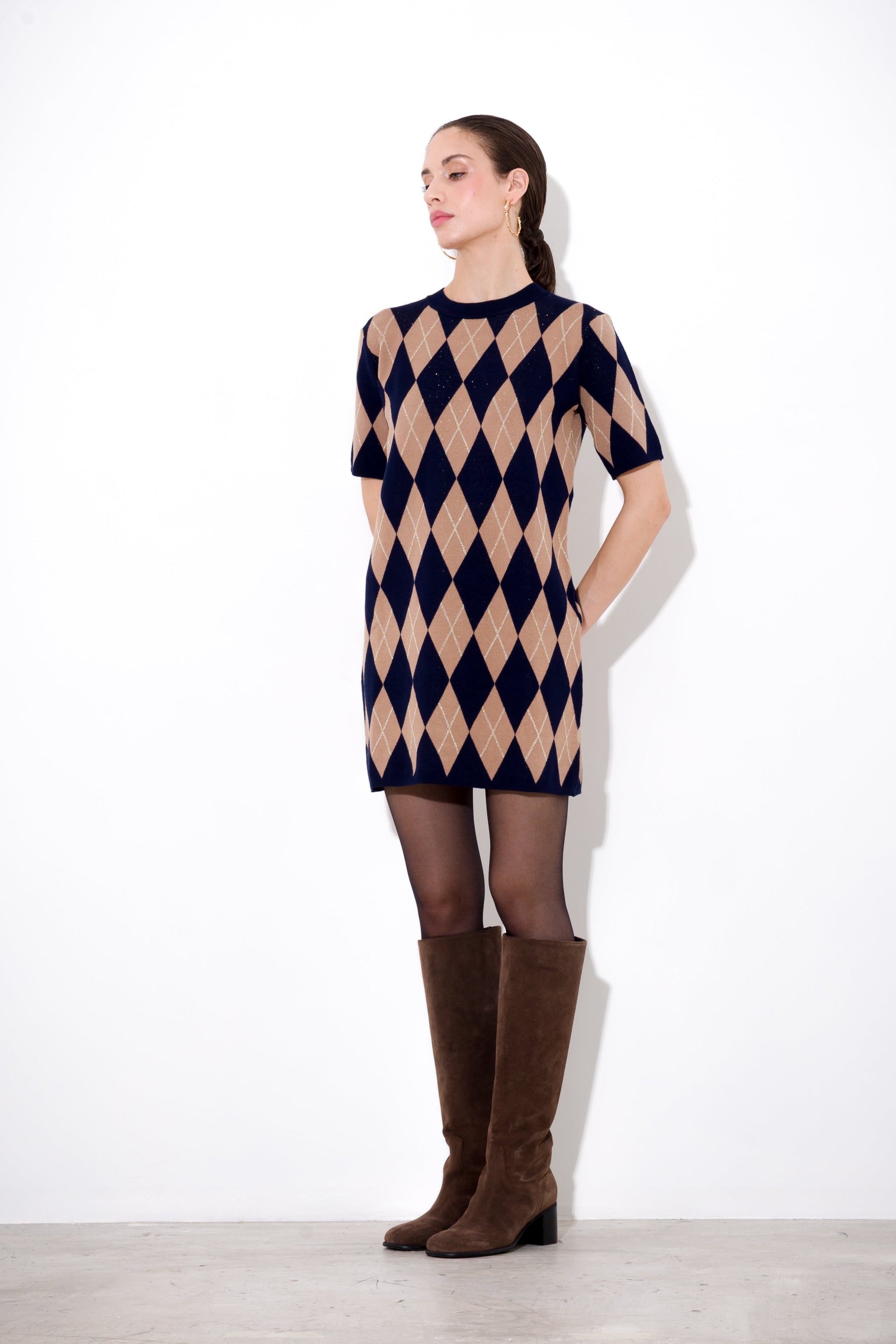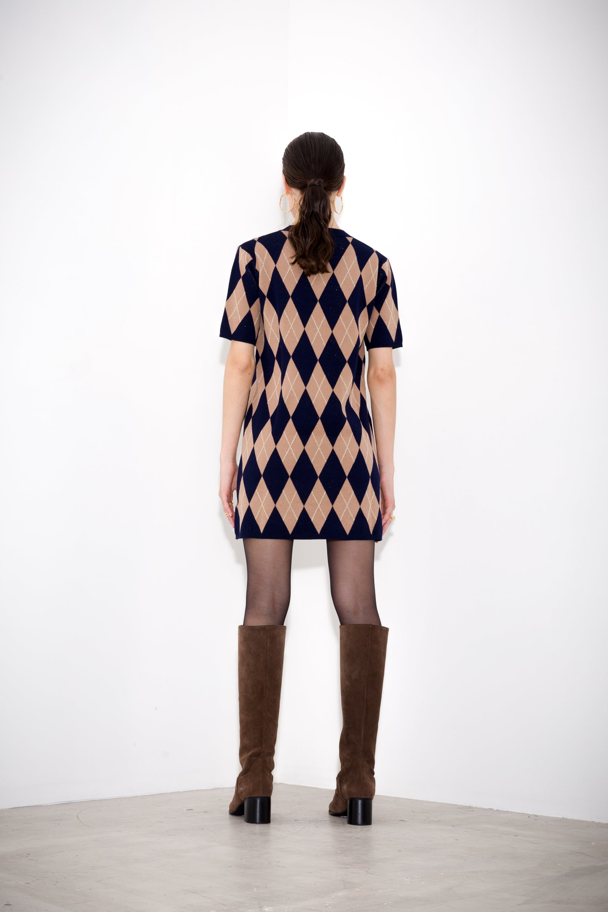 Short-sleeved dress embellished with a refined diamond pattern. The simple crew neck adds a touch of understated elegance, making this dress perfect for casual and semi-formal occasions. Lightweight and comfortable, it's ideal for warmer days in style.