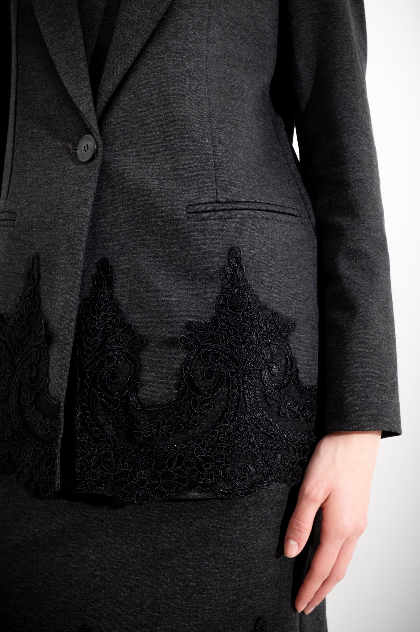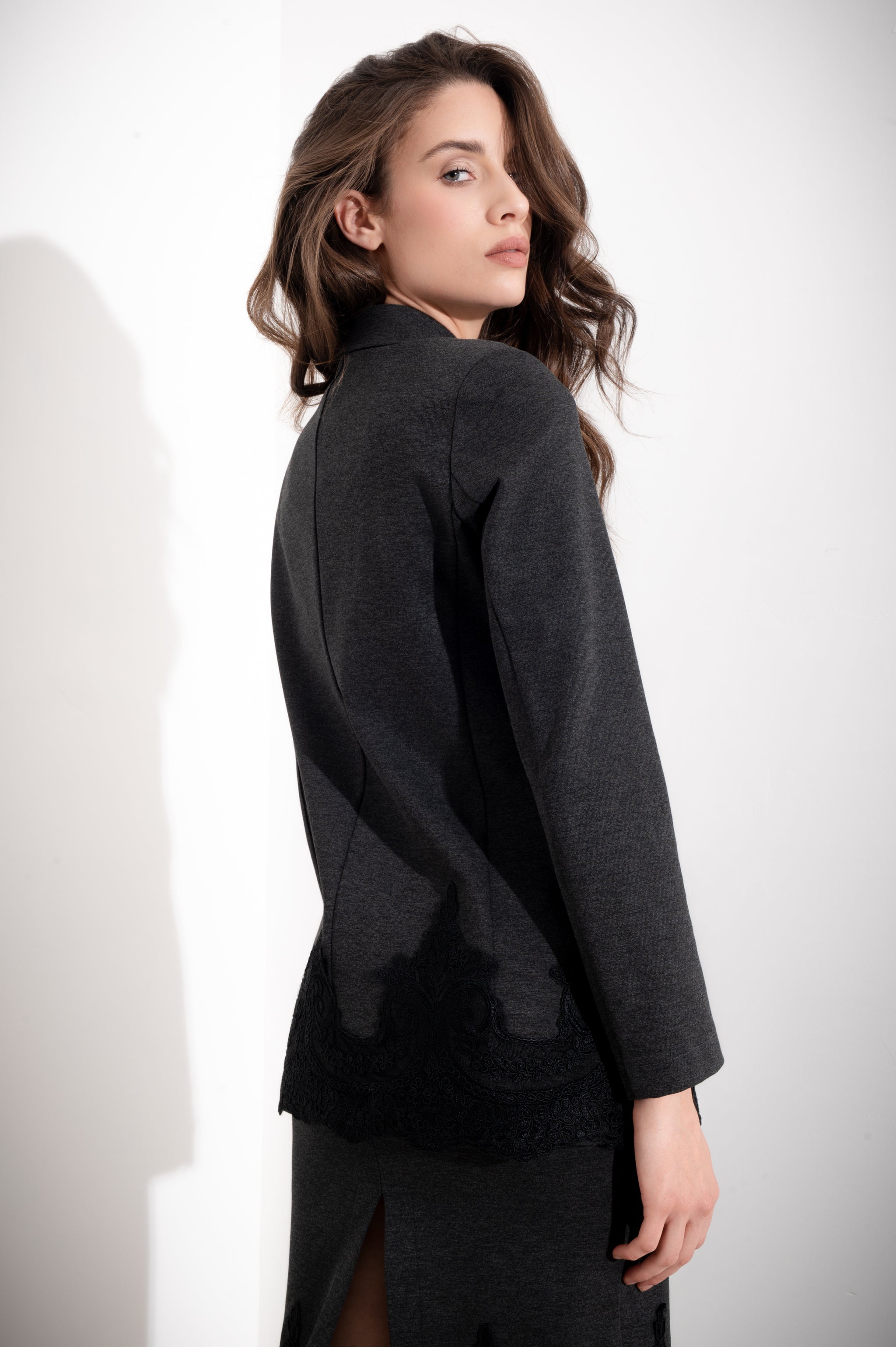 Giacca strutturata con pizzo sul fondo, maniche lunghe, sfoderata, rever classico e tasche a filetto sul davanti. Un capo versatile che unisce eleganza e praticità, perfetto per chi desidera un tocco di raffinatezza nel proprio guardaroba. Il dettaglio in pizzo conferisce un'allure sofisticata, mentre la struttura della giacca garantisce una silhouette impeccabile. Ideale da indossare su abiti, gonne o pantaloni per creare look sia formali che casual con stile.