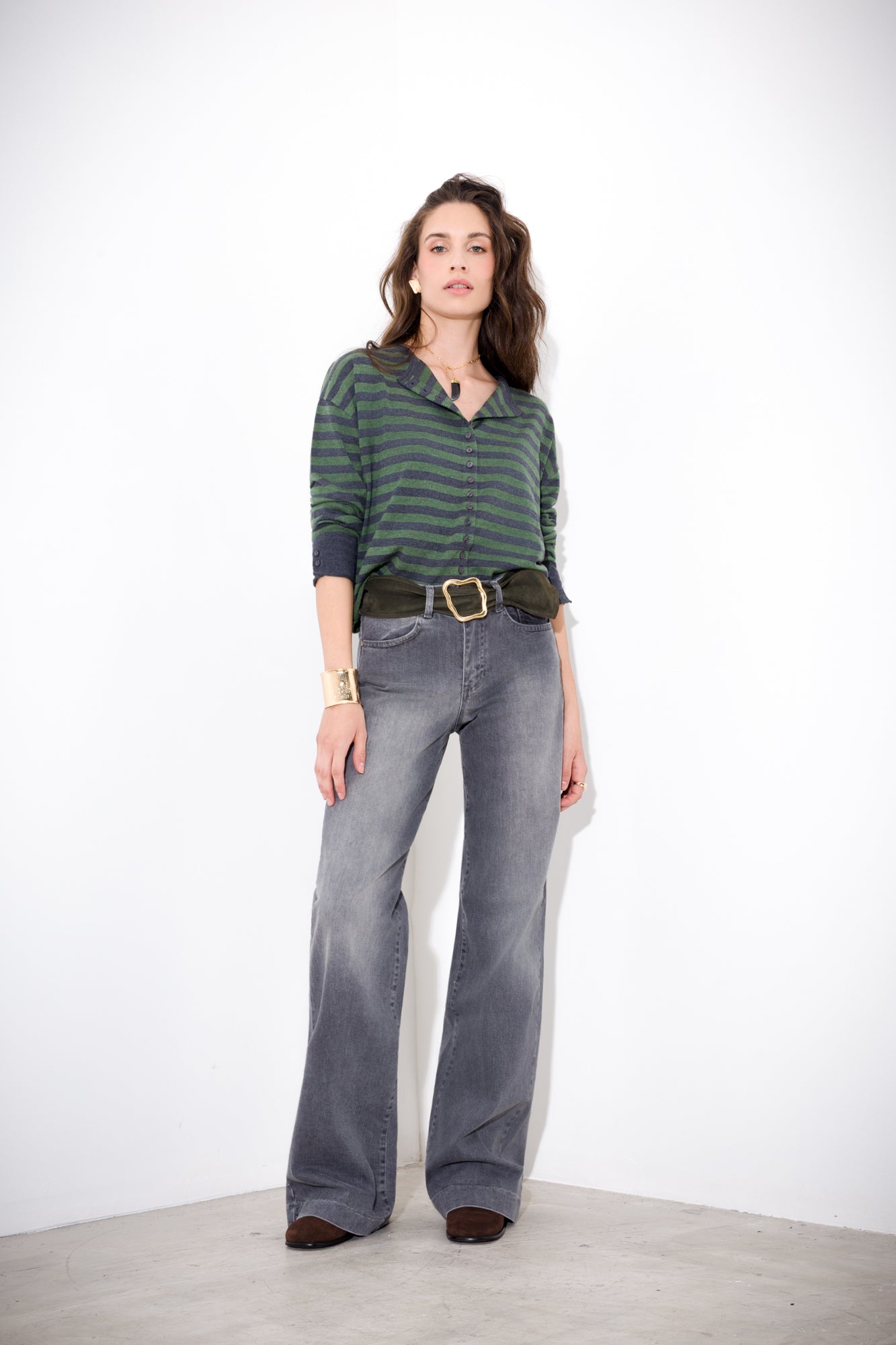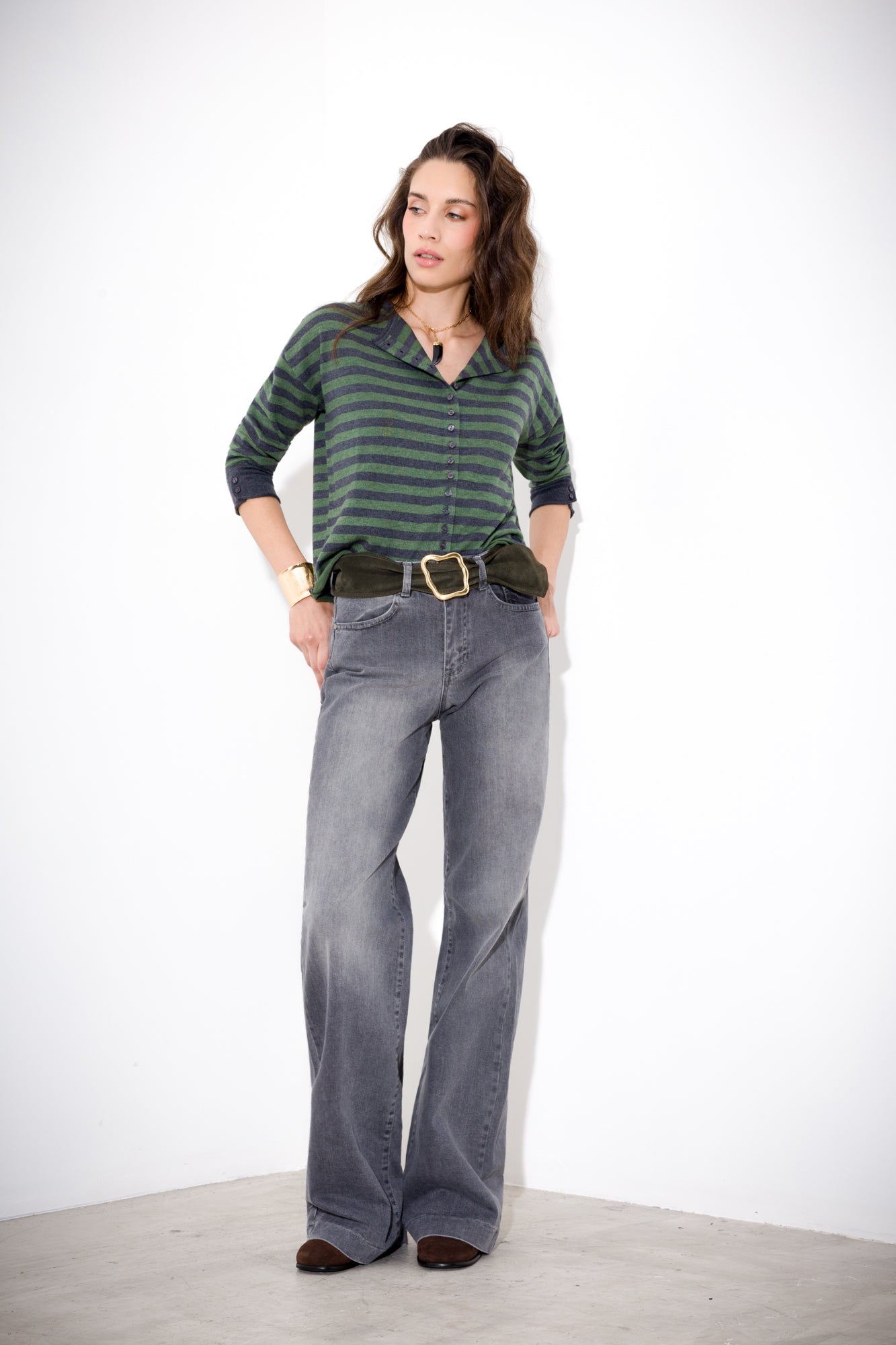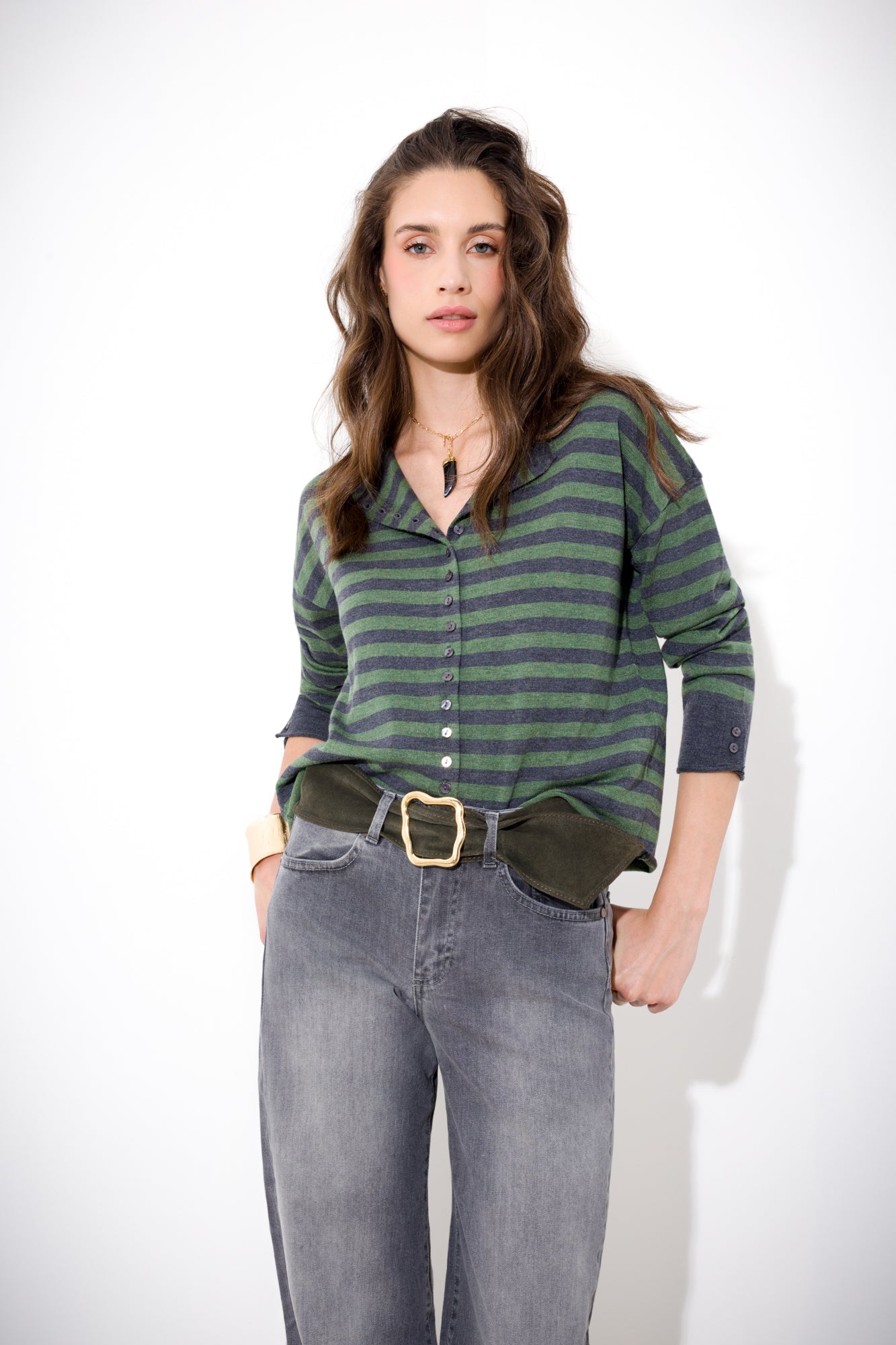 Cardigan a righe con chiusura a bottoncini, perfetto per aggiungere un tocco di stile classico e versatile al tuo guardaroba. Le maniche lunghe sono dettagliate con due bottoncini sul fondo, che creano un elegante effetto polsino.