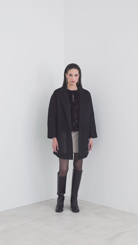 Questa giacca corta in tessuto bouclé nero impreziosita da paillettes dona un tocco di eleganza e luminosità a ogni outfit. Perfetta per serate speciali o per aggiungere un dettaglio sofisticato al look quotidiano, unisce stile e comfort in un capo versatile e raffinato.
