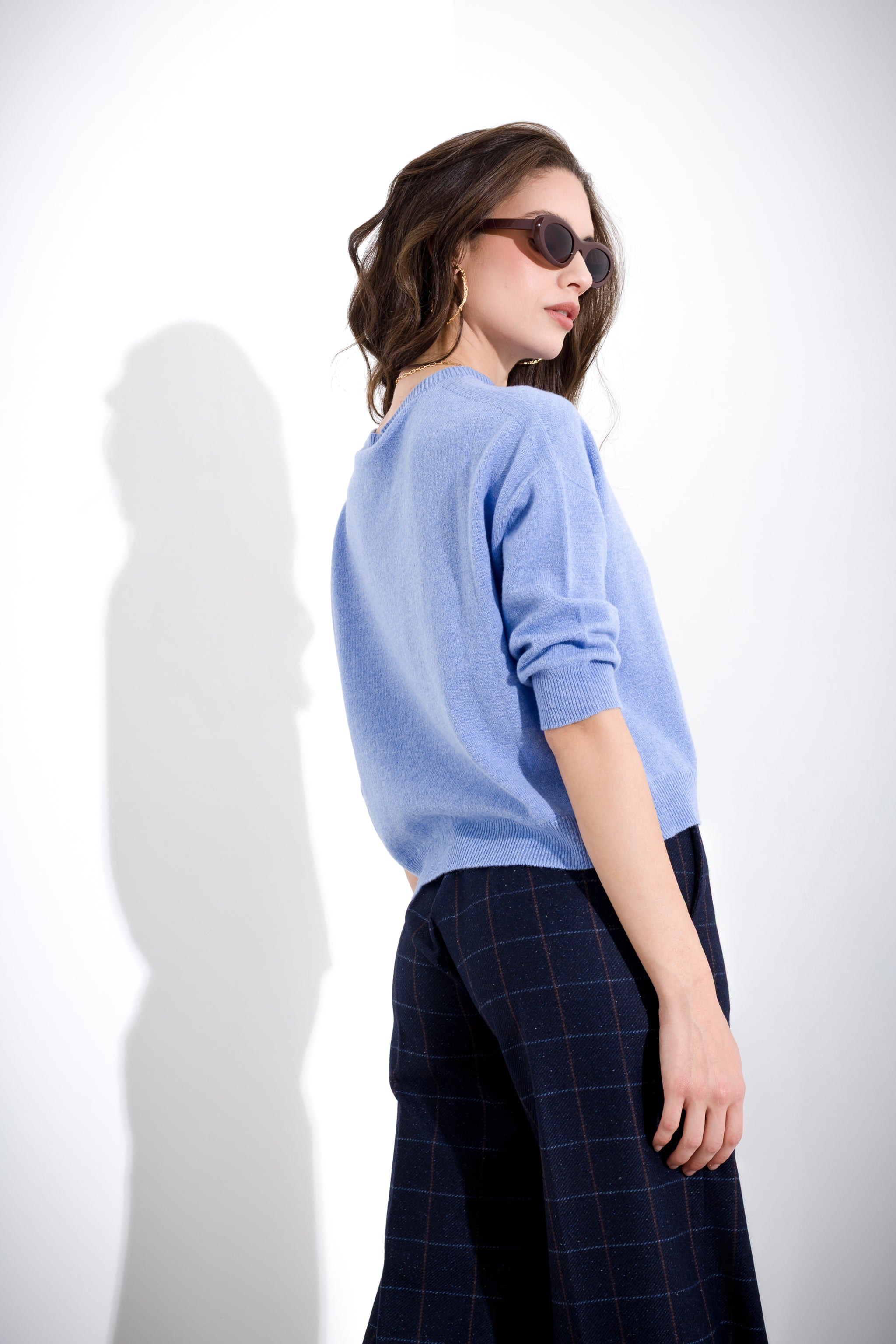 This boxy cashmere sweater with 3/4 sleeves features a classic crew neck and dropped armholes for soft comfort and a sophisticated look. Perfect for those seeking elegance and warmth in any season, it combines style and practicality with high-quality materials.